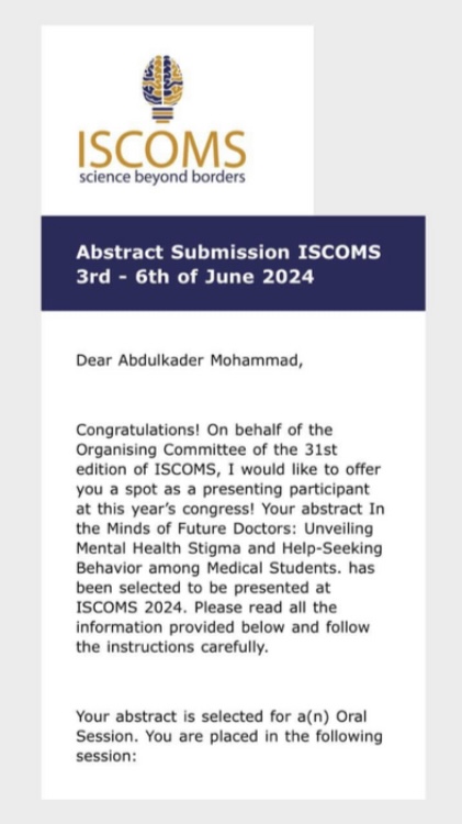 ويُجسّد هذا التكريم من ISCOMS 2024 (المؤتمر الدولي لطلبة العلوم الطبية) جودة ومصداقية الأبحاث التي يقدّمها مختصّونا.